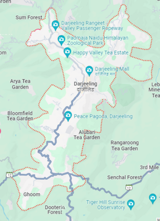 Tiger Hill offers breathtaking views of the sunrise over the Himalayas, including the majestic Mount Kangchenjunga, the third highest peak in the world. Tiger Hill is located about 11 kilometers (6.8 miles) from the town of Darjeeling and at an altitude of around 2,590 meters (8,497 feet) above sea level. Tiger Hill is famous for its panoramic views of the sunrise over the Himalayas. On clear mornings, visitors can witness the spectacle of the sun illuminating the snow-capped peaks, including Mount Kangchenjunga, in brilliant hues of orange and gold. Apart from Mount Kangchenjunga, Tiger Hill offers stunning views of other peaks in the Himalayan range, including Mount Everest on clear days. The best time to visit Tiger Hill is during the early morning hours to witness the sunrise. It's advisable to arrive well before sunrise to secure a good viewing spot, as it can get crowded, especially during peak tourist seasons.